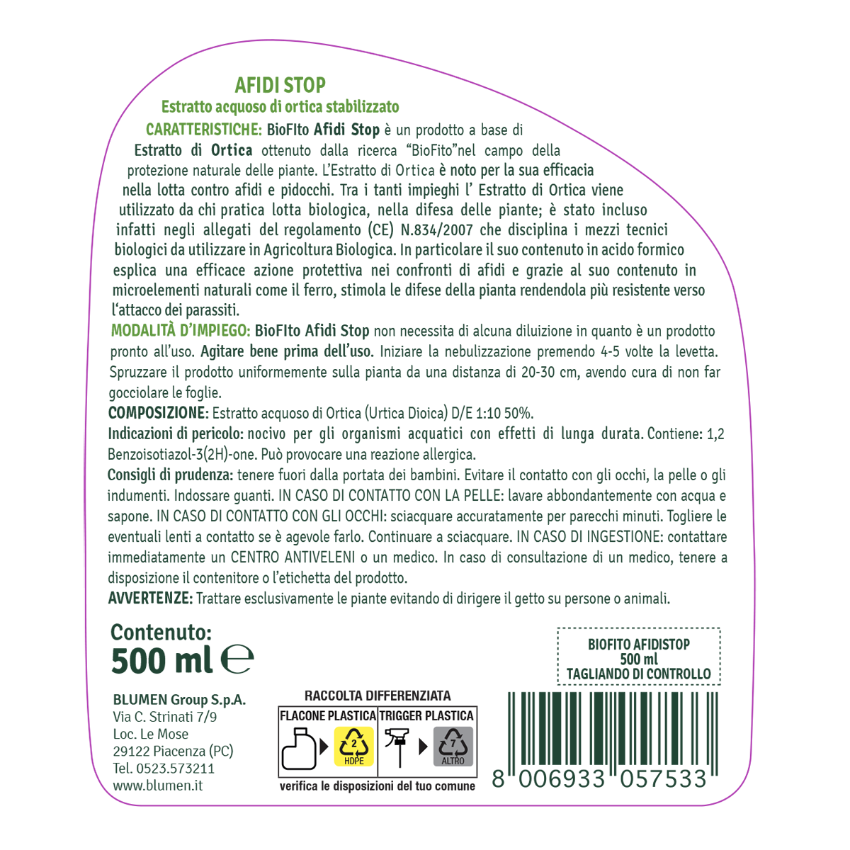 Prodotto totalmente naturale ottenuto dalla pianta di ortica, non necessita di alcuna diluizione ed è pronto all’uso. Grazie alla presenza di sostanze attive naturali contenute nella pianta di ortica, AFIDI STOP spruzzato sulle parti delle piante infestate, le rende inospitali per questi parassiti (afidi – pidocchi) che si allontanano dalla pianta stessa liberandola dalla loro dannosa pre-senza. Il Ferro, contenuto in AFIDI STOP, stimola la pianta rendendola più resi-stente all’attacco dei parassiti.