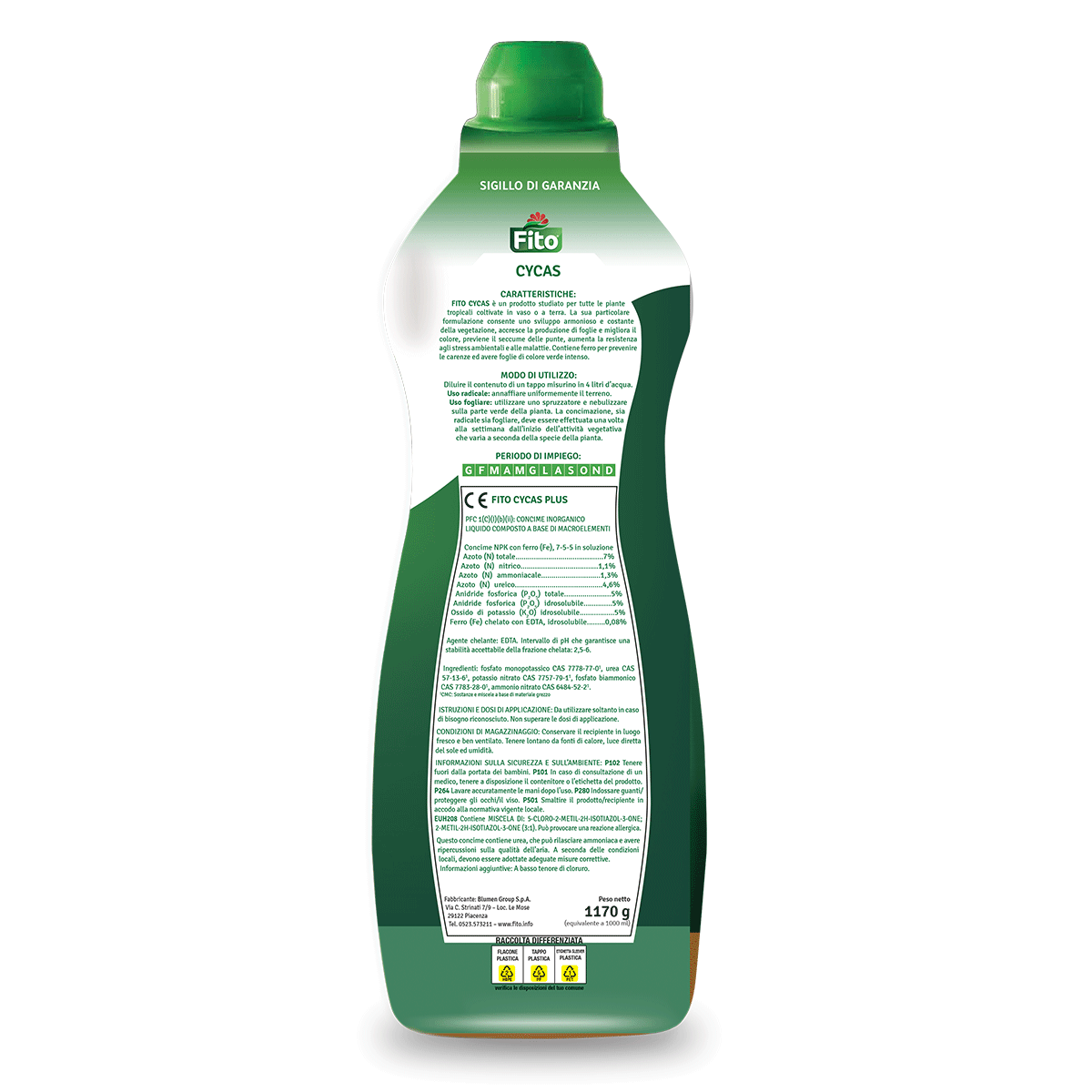 Uso radicale e fogliare: un tappo misurino ogni 4 litri di acqua. Utilizzare una volta alla settimana dall’inizio dell’attività vegetativa, che varia a seconda della specie della pianta.