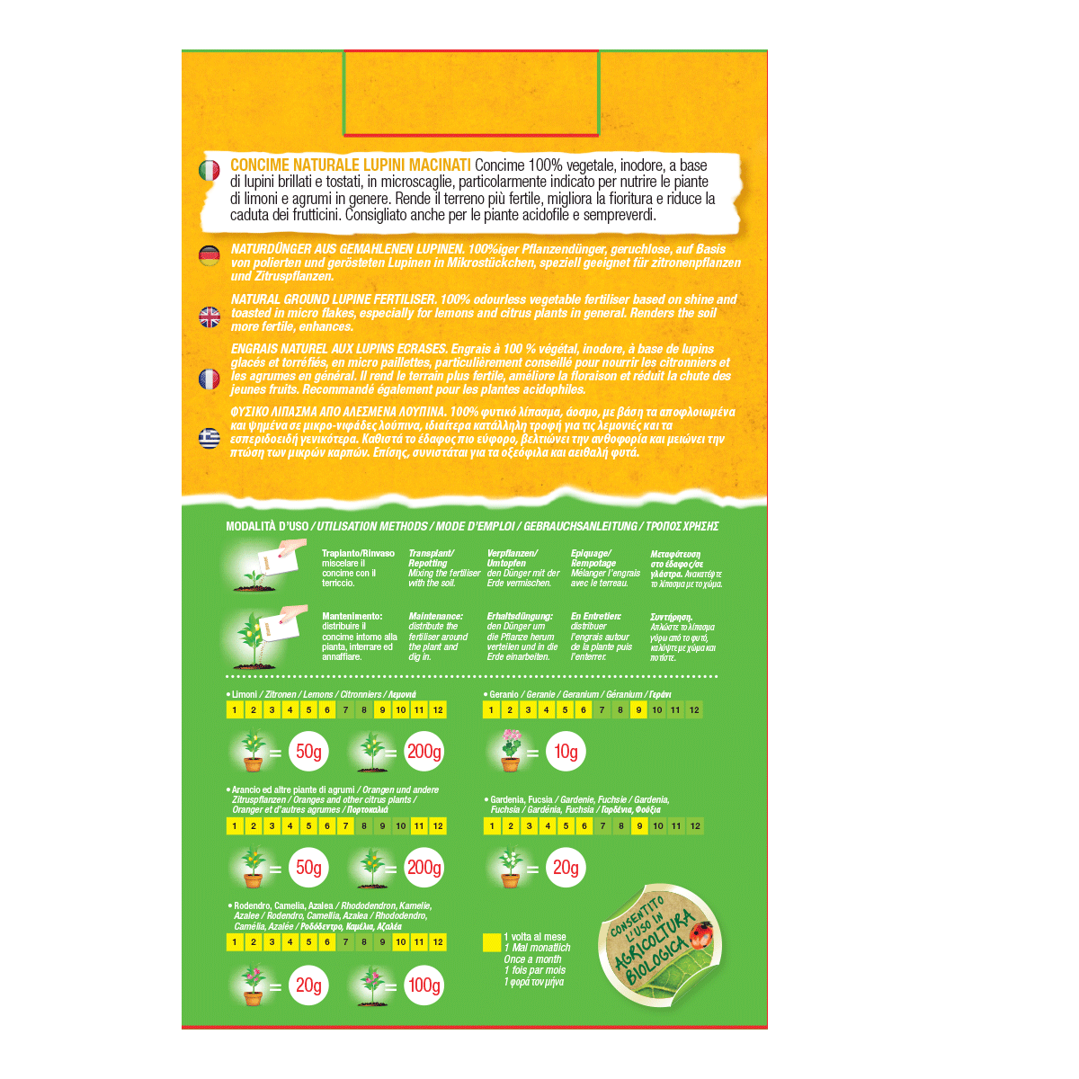 Mantenimento: distribuire il concime intorno alla pianta, interrare ed annaffiare. Usare una volta al mese da marzo a novembre.