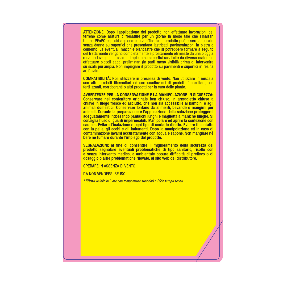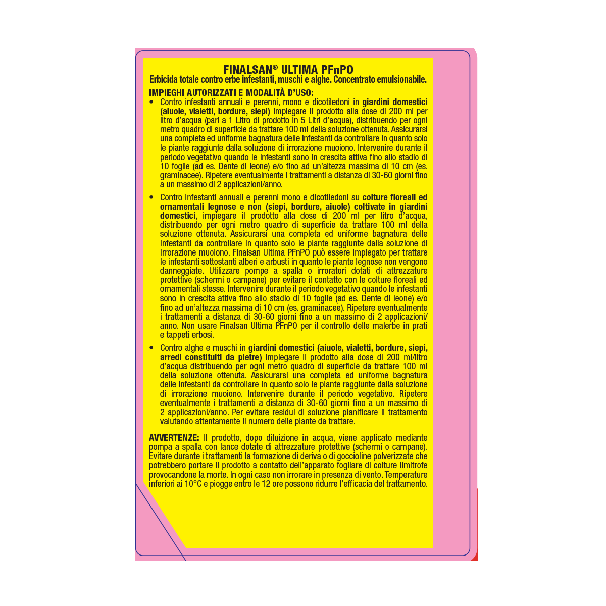 Utilizzate Finalsan Ultima in caso di erbe infestanti annuali e perenni mono e dicotiledoni, quali ad esempio Dente di leone (Taraxacum officinale), plantaggine (Plantago maior), Poa spp., Lamium sp. Stellaria media, stoppione (Cirsium arvense), Polygonum aviculare, muschi ed alghe. In caso di ricrescita delle infestanti, ripetete il trattamento a distanza di 30-60 giorni dall’ultimo. Potete utilizzare Finalsan Ultima con un massimo di 2 applicazioni all’anno.