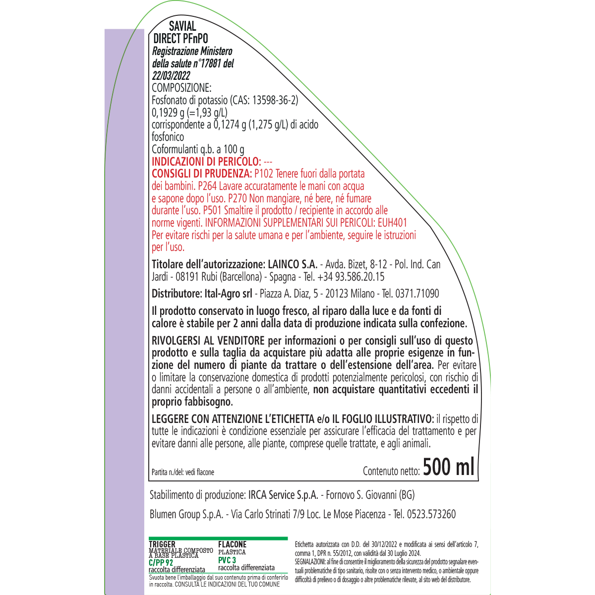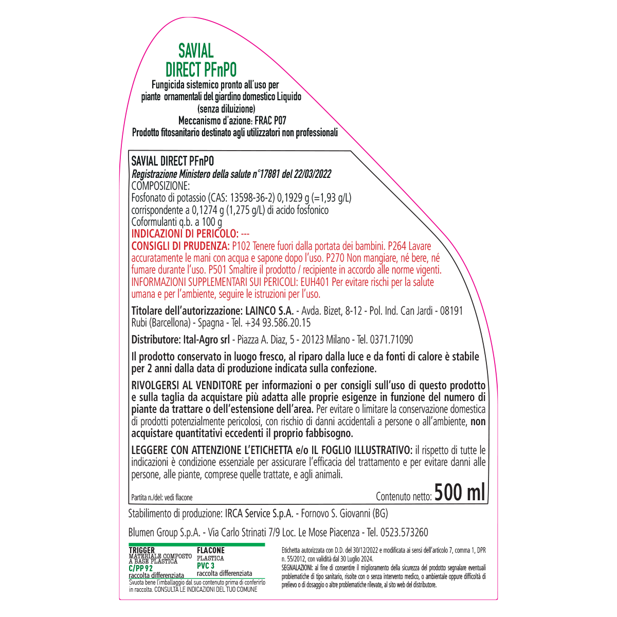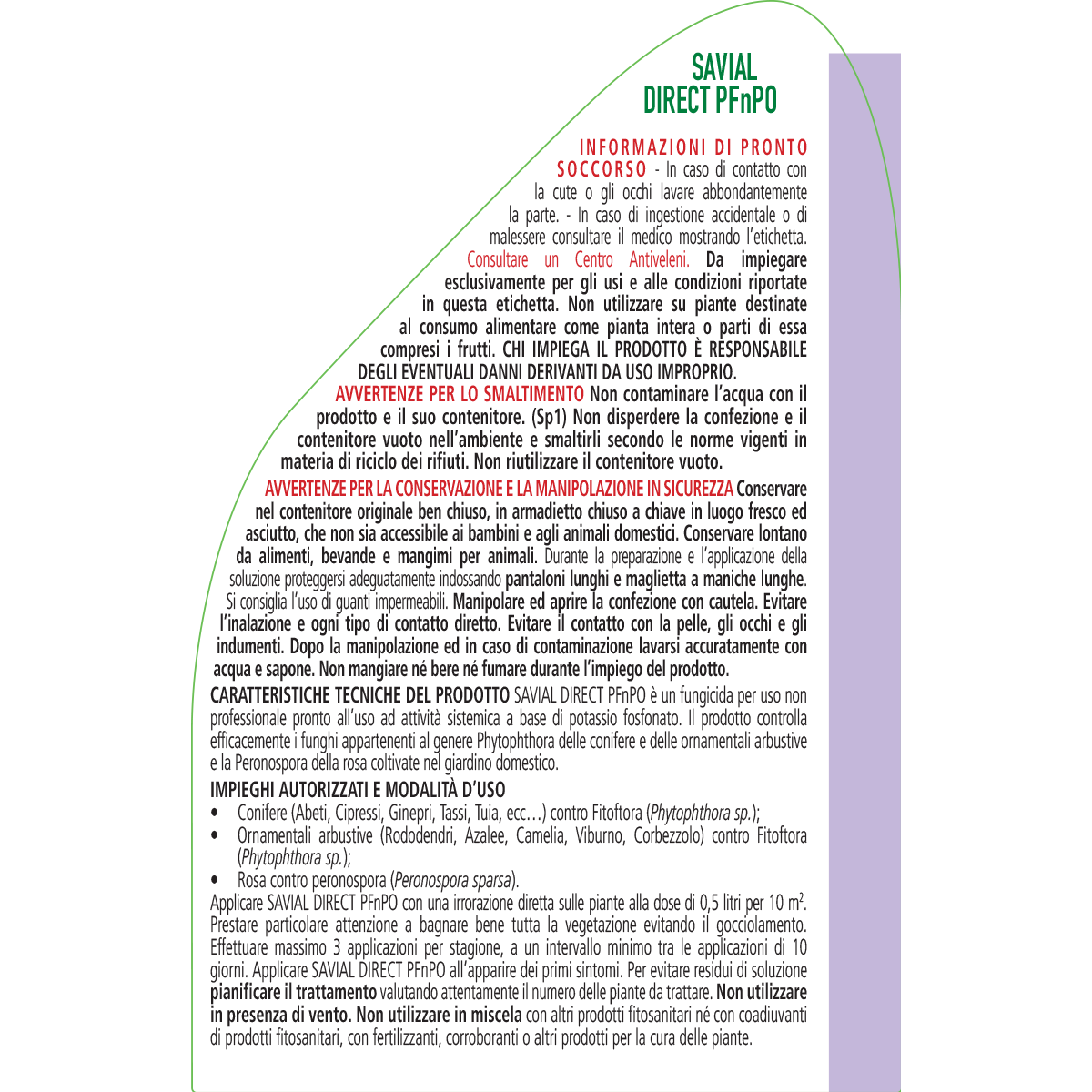 Fungicida Sistemico PFnPO per uso non professionale pronto all’uso ad attività sistemica a base di potassio fosfonato. Il prodotto controlla efficacemente i funghi appartenenti al genere Phytophthora delle conifere e delle ornamentali arbustive e la Peronospora della rosa coltivate nel giardino domestico.