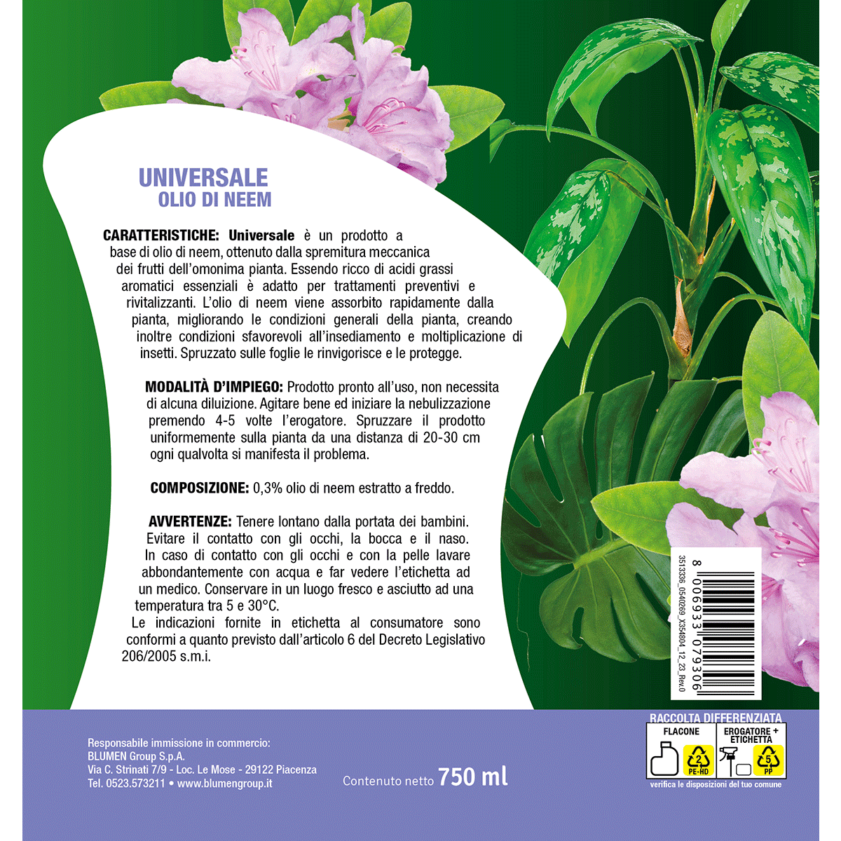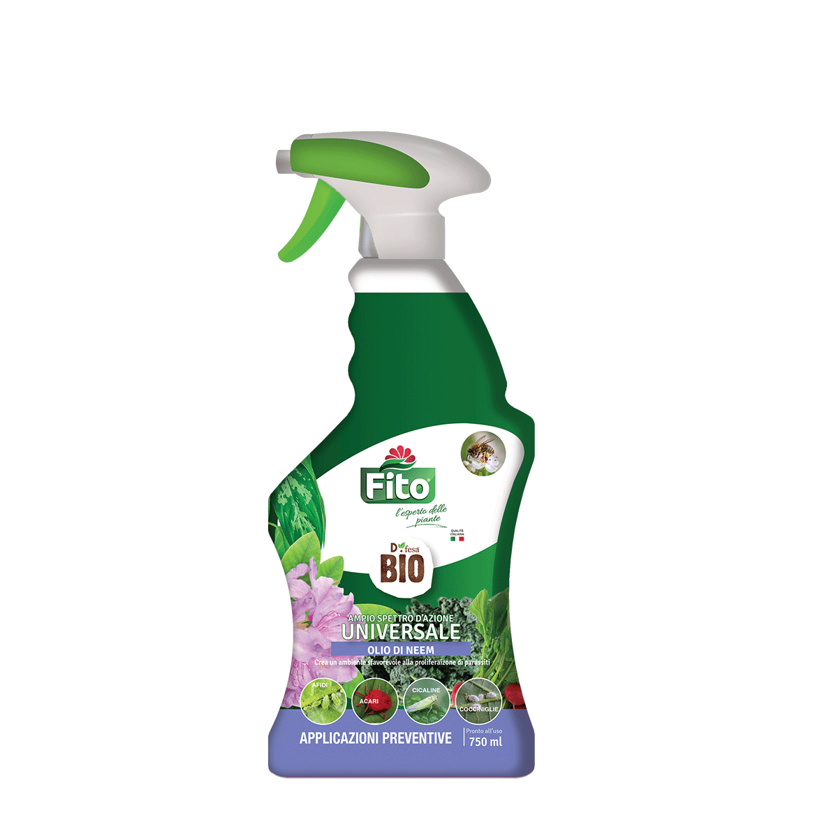 L’olio di neem viene ottenuto dalla spremitura meccanica dei frutti dell’omonima pianta. Essendo ricco di acidi grassi aromatici essenziali crea un ambiente sfavorevole alla proliferazione di organismi nocivi. L’olio di neem viene assorbito rapidamente dalla pianta, migliorando lo stato salutare generale e svolgendo un’azione repellente verso insetti succhiatori e crittogame quali oidio, ticchiolatura, ruggine, ecc. Spruzzato sulle foglie le rinvigorisce e le protegge.